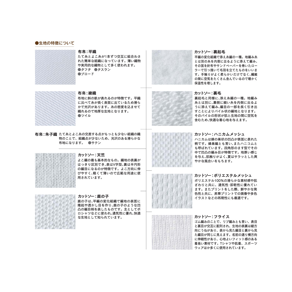 こちらの商品につきましては、一箇所一色プリント(特色以外)の料金が含まれております。その他の条件(特色≪金・銀・蛍光カラー≫プリント、2箇所以上のプリント、2色以上のプリント)に関しては、別途見積の請求をお願い申し上げます。予めご了承下さい。一枚ずつ「商品たたみ袋入れ」にてお届けいたします。袋入れ不要の場合はご連絡頂けましたら若干価格がお安くなります。