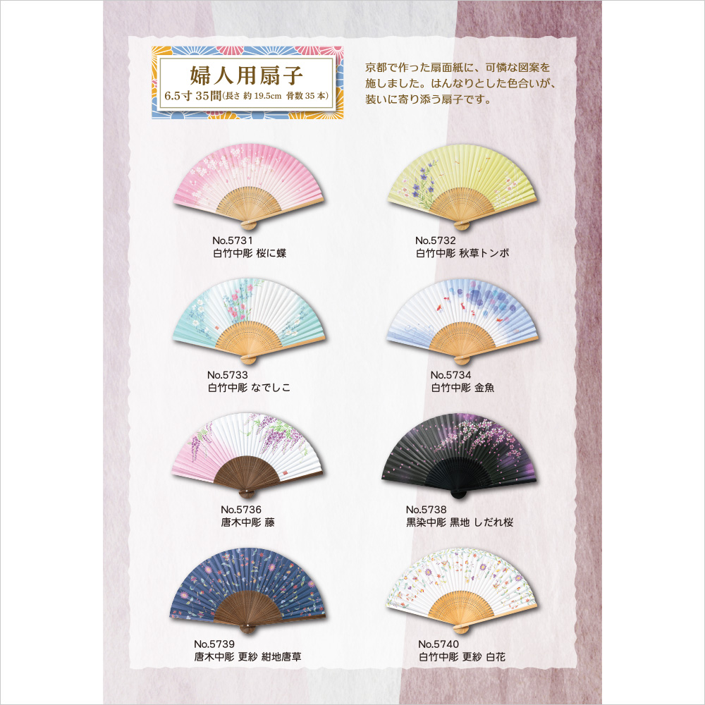 ベーシックなタイプの婦人用扇子。 女性らしい柄をたくさん揃えました。
