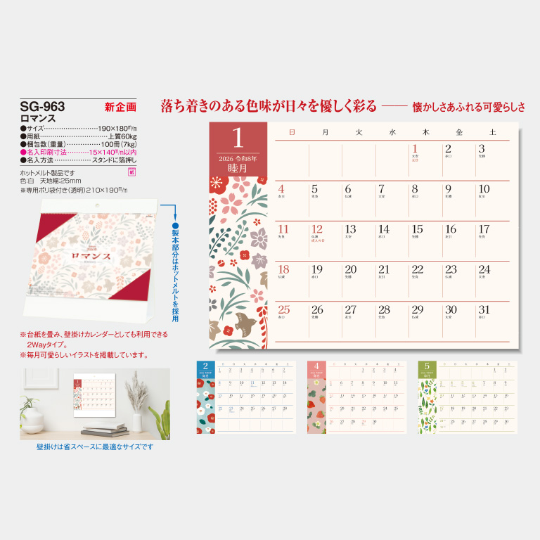 ノスタルジックな雰囲気が漂う、レトロ感覚の絵柄と配色で構成しました。台紙をたたみ、壁掛けカレンダーとしても利用できる2Wayタイプ。