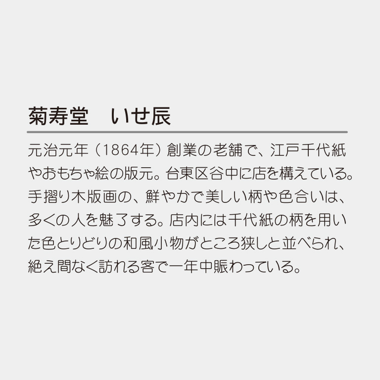 菊寿堂 いせ辰。創業元治元年(1864年)の江戸千代紙やおもちゃ絵の版元。人気のカレンダーです。