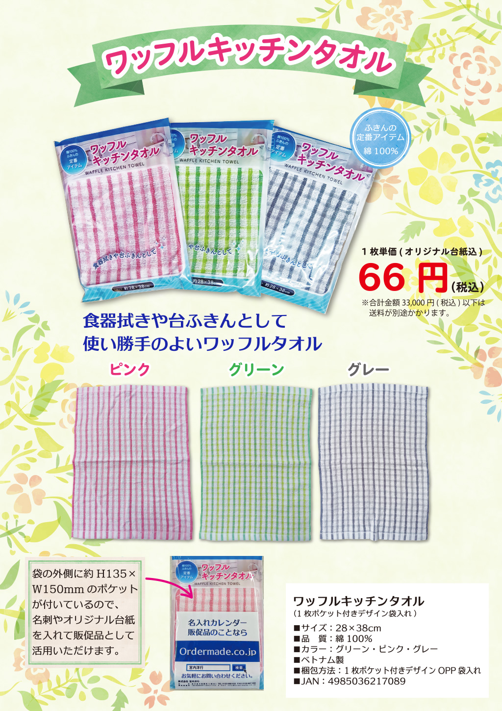 天然素材の綿100%を使用。独特の凹凸があるワッフル織りは、吸水性と速乾性に優れており、食器拭きや台ふきんとして毎日の家事で大活躍します。袋の外側に、約H135×W150mmの大型ポケットを装備。名刺はもちろん、オリジナルのメッセージカードやクーポン、ショップカードを封入することで、受け取った瞬間に御社のブランドを強く印象付けます。展示会の粗品や、新年のご挨拶、引っ越しのご挨拶など、どんなシーンでも外さない定番アイテムです。